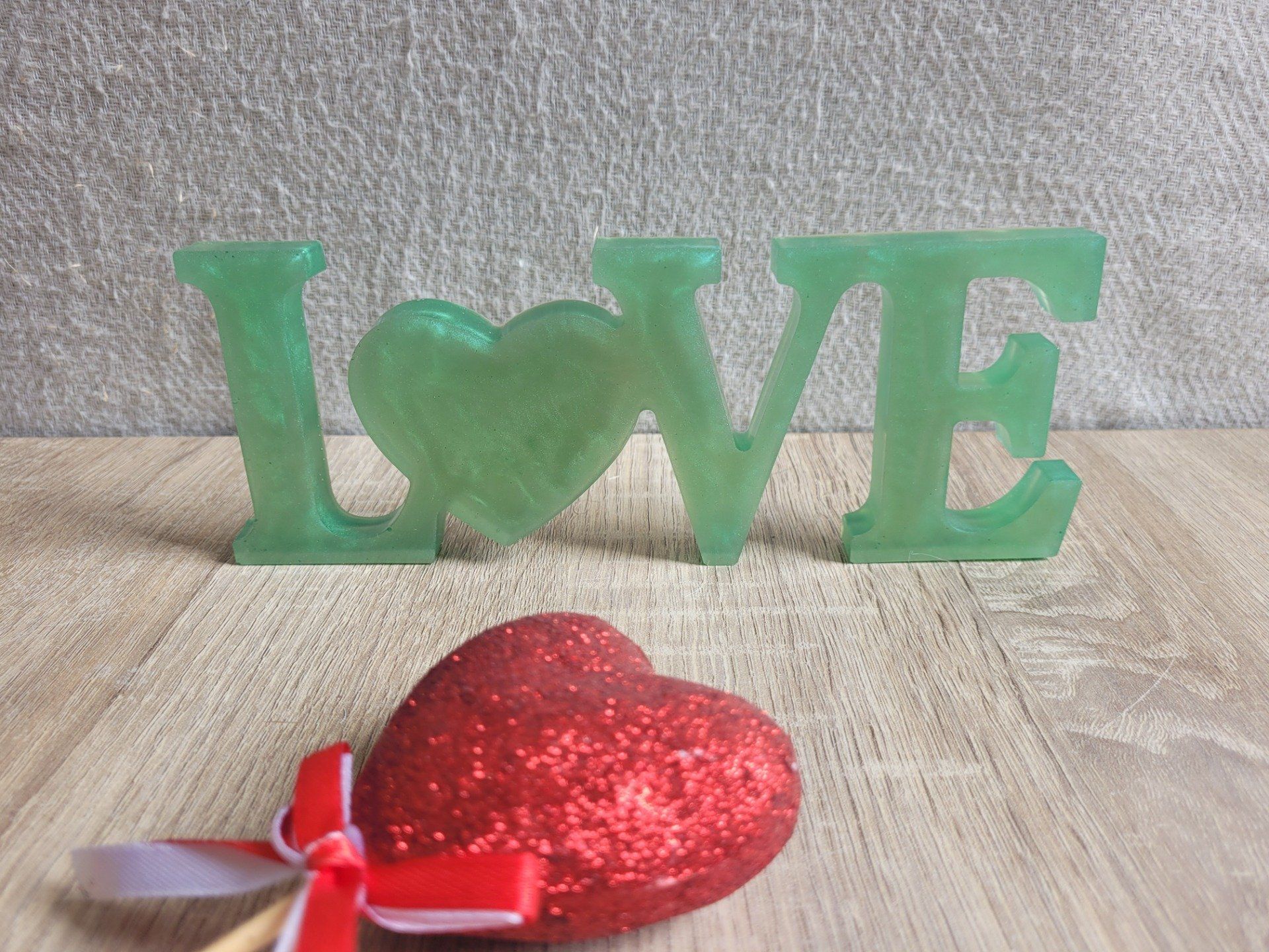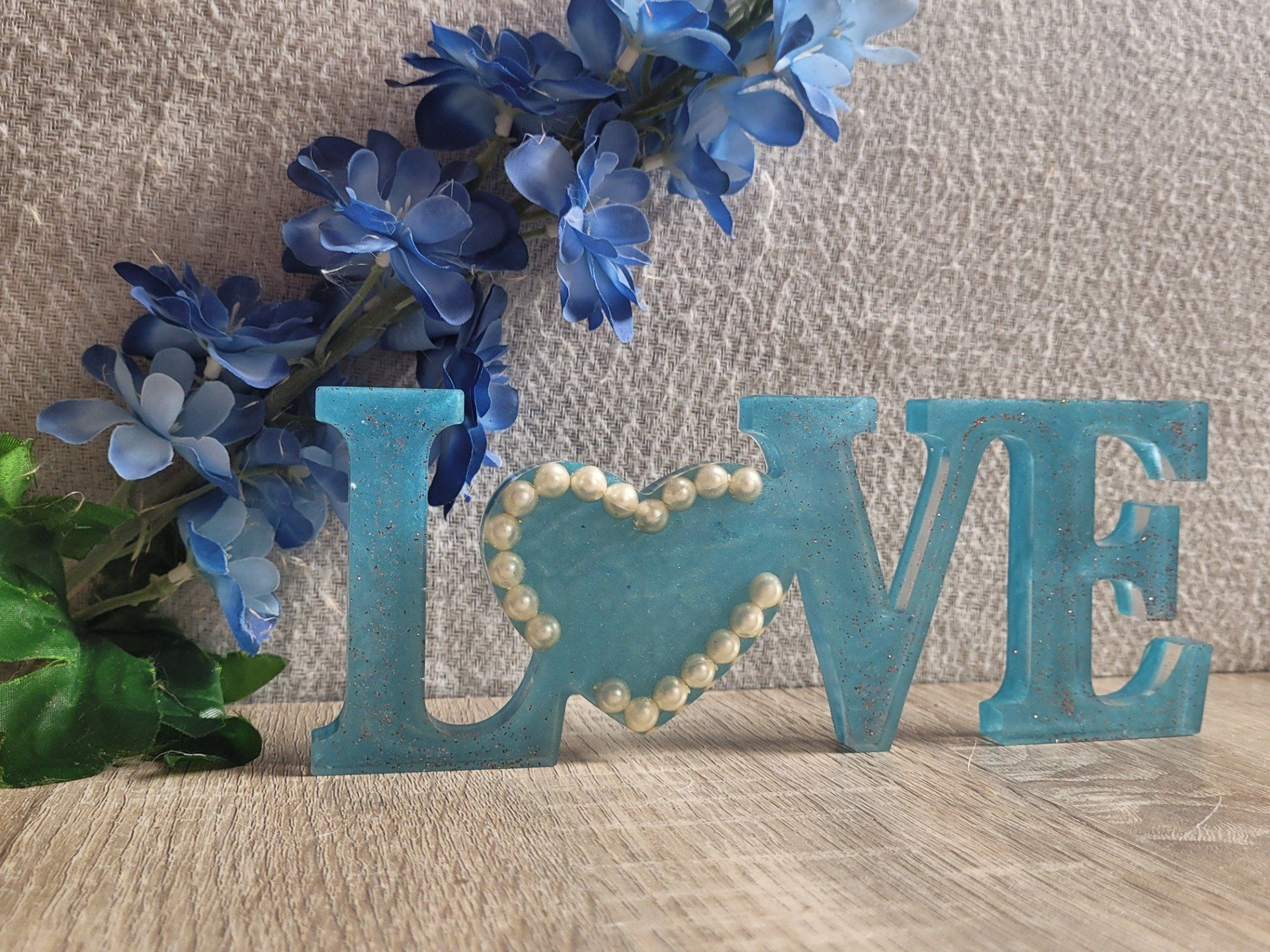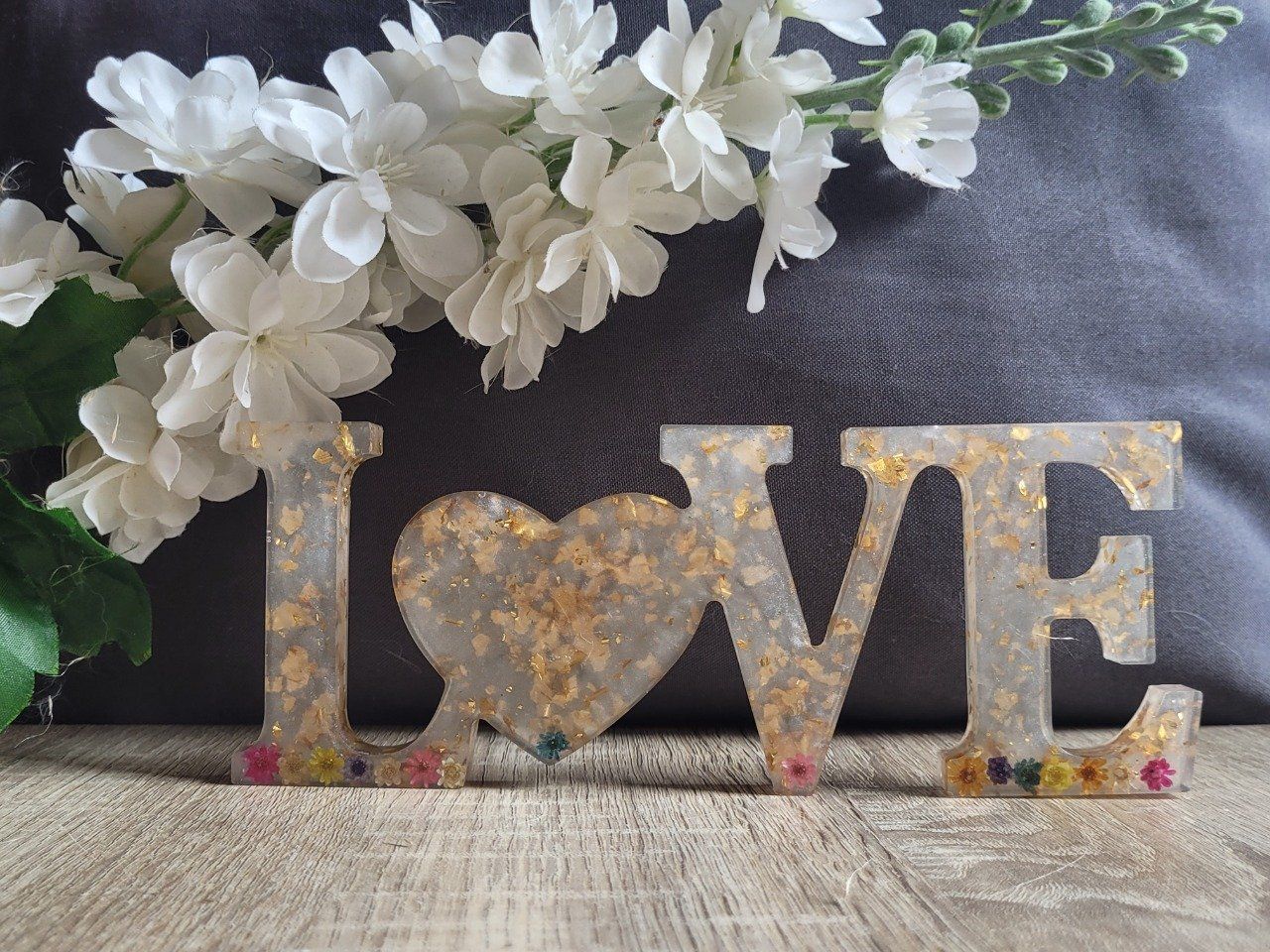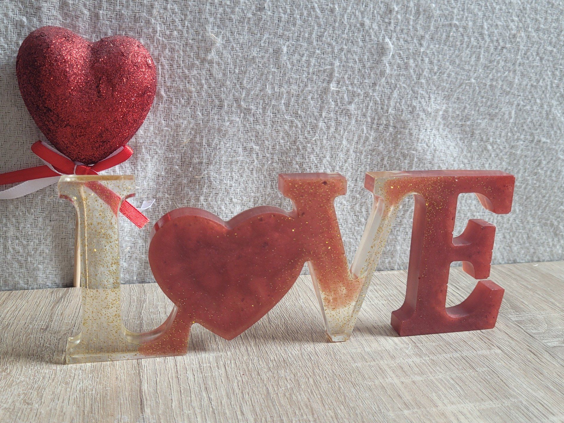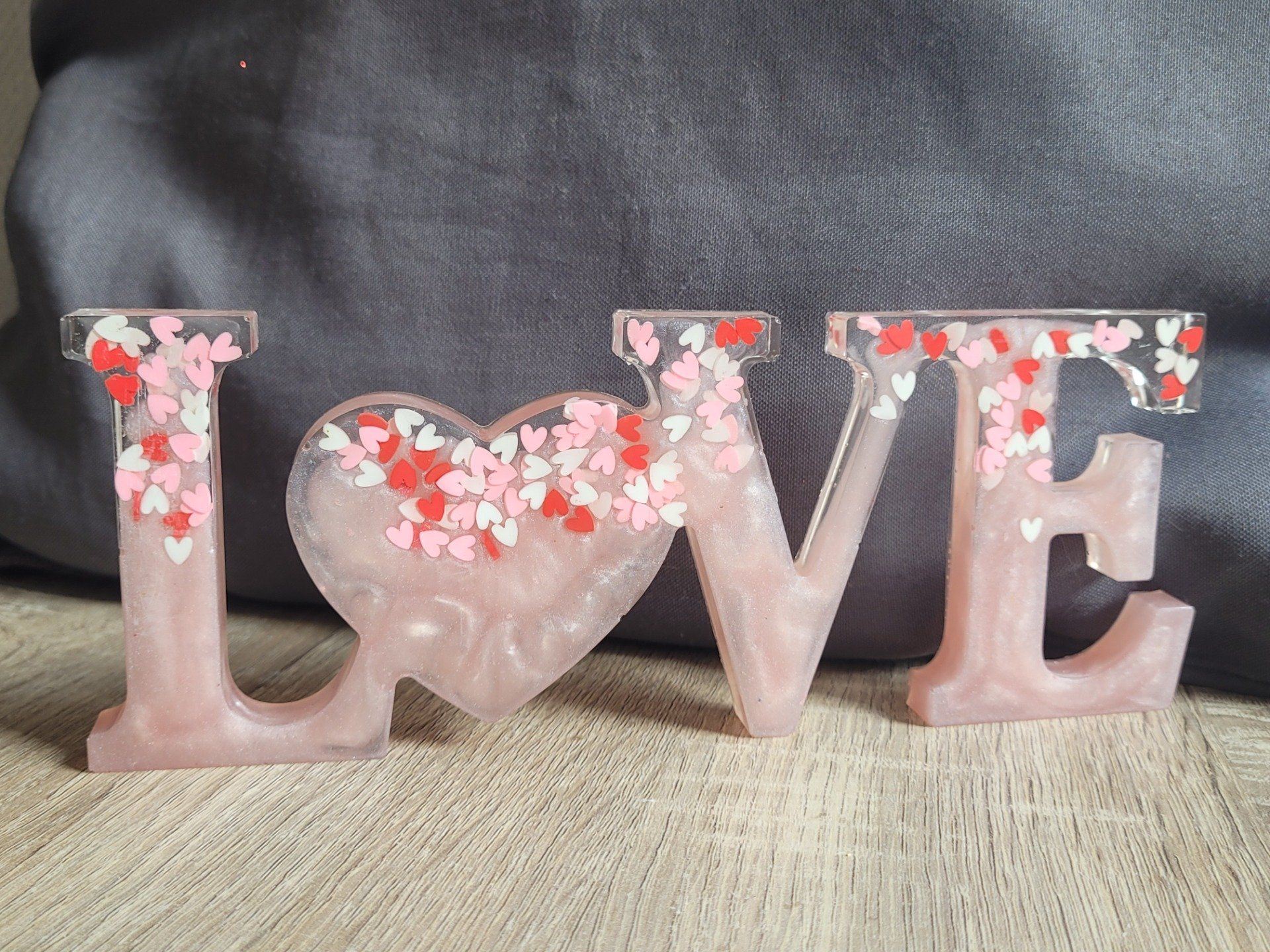 Cette création en résine époxy capture l'amour avec finesse et modernité, mêlant transparence, éclats colorés, colorie pour un effet visuel unique